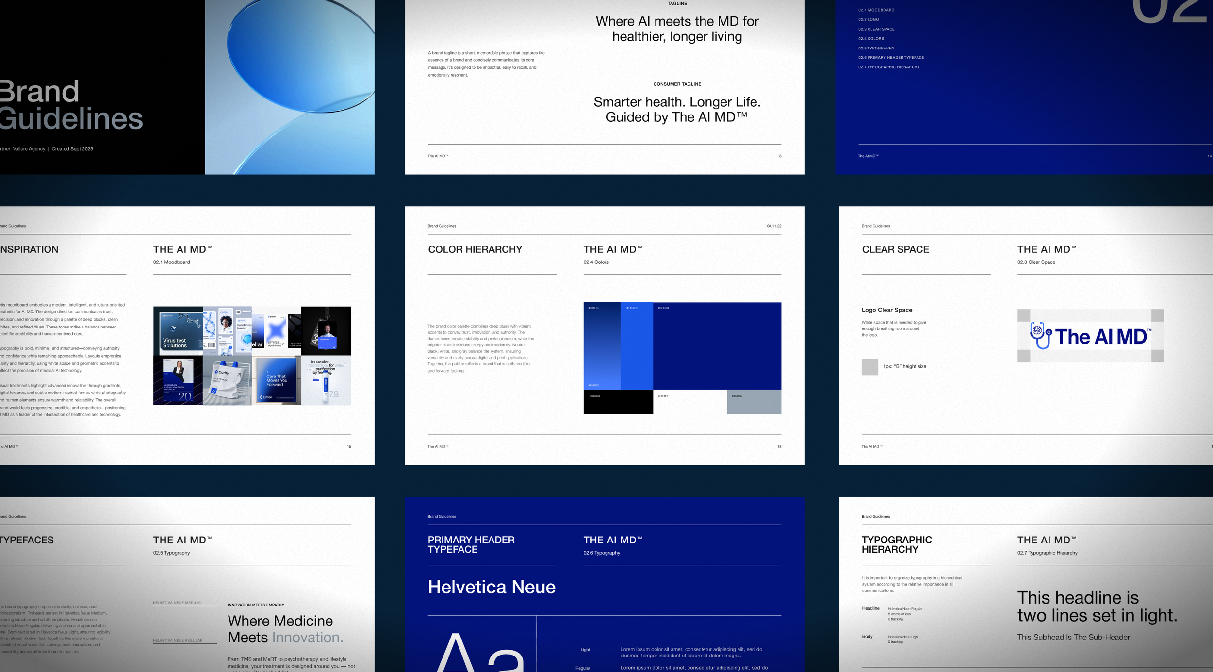 We built the AI MD™ visual identity around a deliberate tension: the precision and trust of medicine, expressed through the energy and innovation of technology. Blue was the natural anchor for the brand, a color with deep roots in medical credibility and institutional trust, but we pushed well beyond a single tone. A layered blue palette spanning multiple depths and gradients gave the system range, allowing the brand to shift from clean and clinical in one context to dynamic and tech-forward in another.