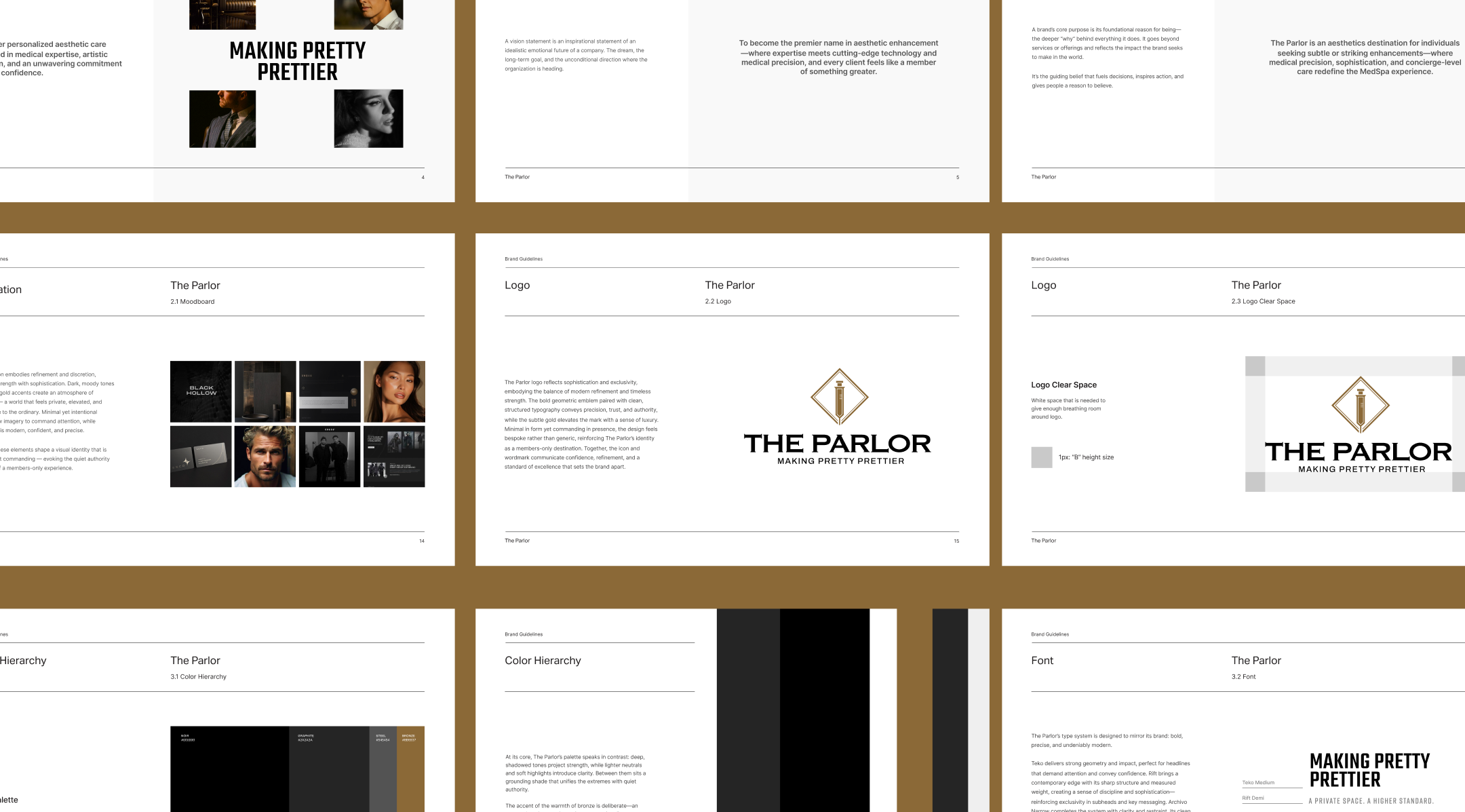 We built the brand from the ground up, translating the founder's vision into a distinct identity system rooted in exclusivity, confidence, and medical credibility. The creative direction was designed to feel more private club than traditional med spa, a deliberate positioning choice in a category dominated by soft, feminine aesthetics. This included the full visual identity, positioning framework, value propositions, brand voice, tone, and headline architecture.